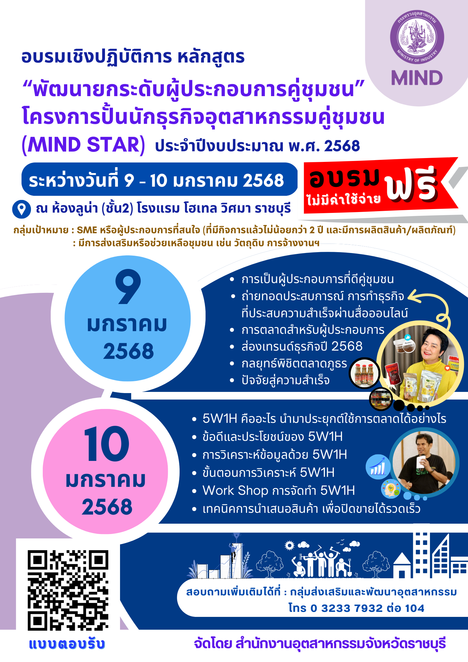 ขอเชิญเข้าร่วมอบรมเชิงปฏิบัติการหลักสูตร “พัฒนายกระดับผู้ประกอบการคู่ชุมชน” โครงการปั้นนักธุรกิจอุตสาหกรรมคู่ชุมชน (MIND STAR) ประจำปีงบประมาณ พ.ศ. 2568 ระหว่างวันที่ 9 - 10 มกราคม 2568 เวลา 08.30 – 16.30 น. ณ ห้องลูน่า (ชั้น2) โรงแรม โฮเทล วิศมา ราชบุรี ตำบลหน้าเมือง อำเภอเมืองราชบุรี